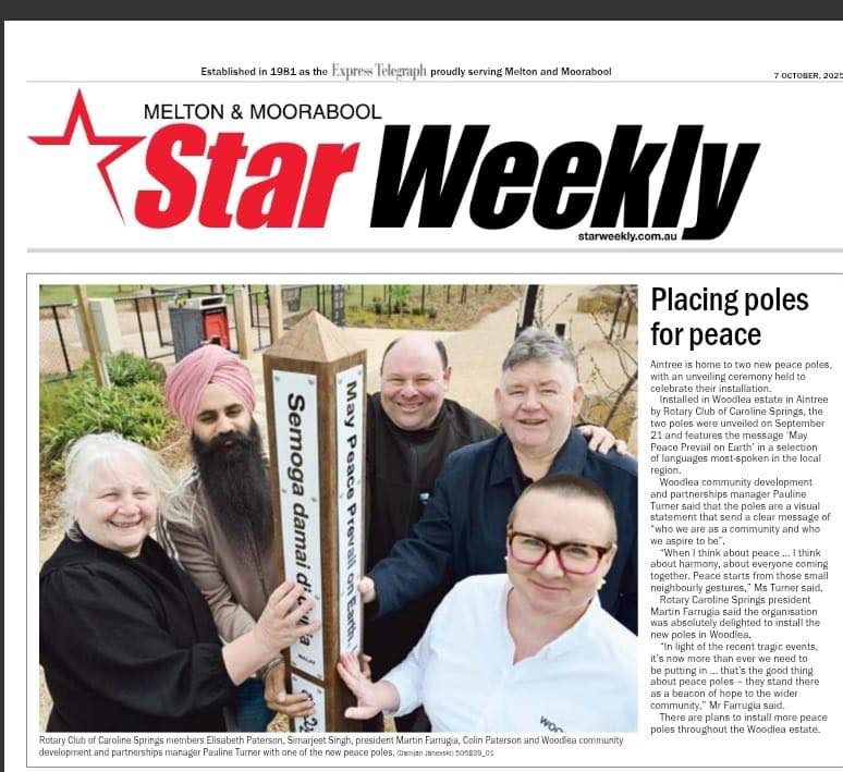 At high noon on the 13 June 2025 Rotary Caroline Springs installed two Peace Pole outside the entrance of the Caroline Springs library. The Peace Pole say in 8 different languages, "May Peace Prevail on Earth". With so much going on in the world in 2025. These serve as a constant reminder that we must always choose Peace and not let our differences get in the way of building better communities and countries. It would not be correct of me to say that we all want the same thing but that we must accept that we must live together in harmony in order to benefit every single citizen of this our planet Earth.