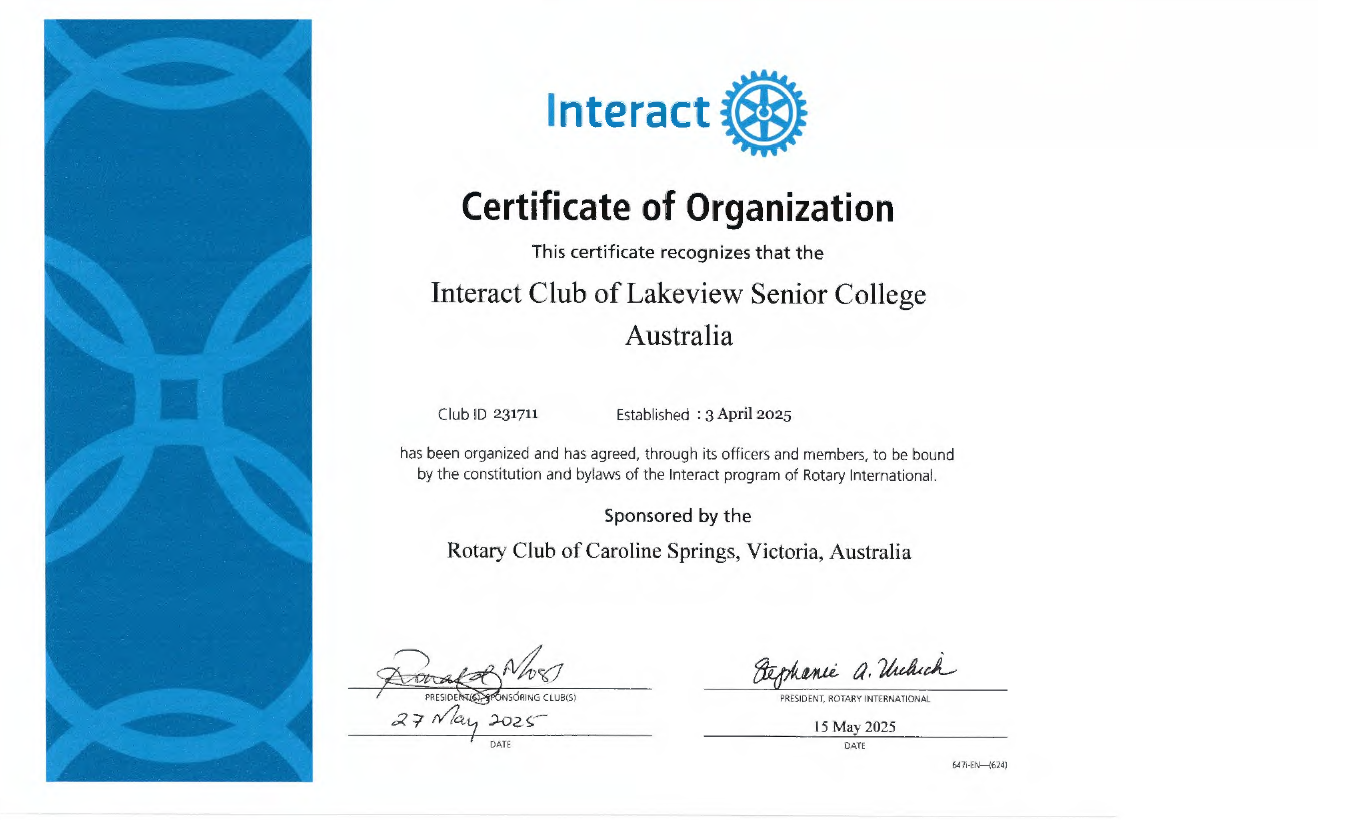 Rotary Caroline Springs is delighted to announce the official Charter Night of the Interact Club at Lakeview Senior College, Caroline Springs.
